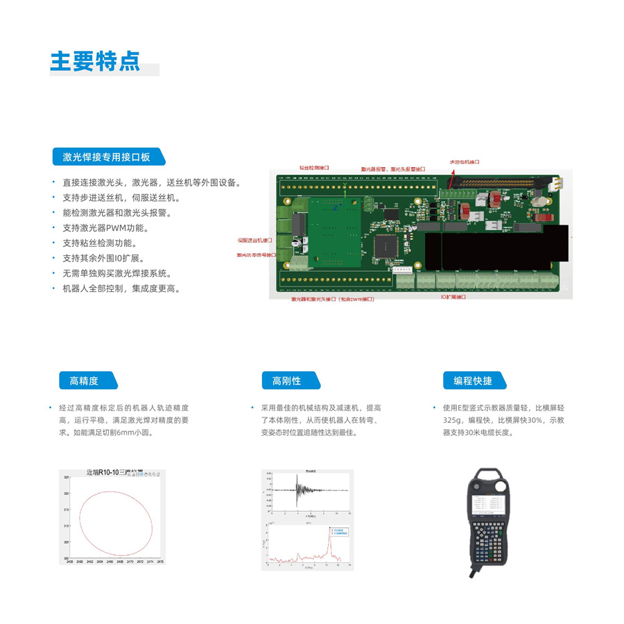 激光焊接机器人主要由本体及电柜构成,同时出厂将标配激光焊接软件包,主要用于激光焊接、激光切割、激光熔覆等应用。