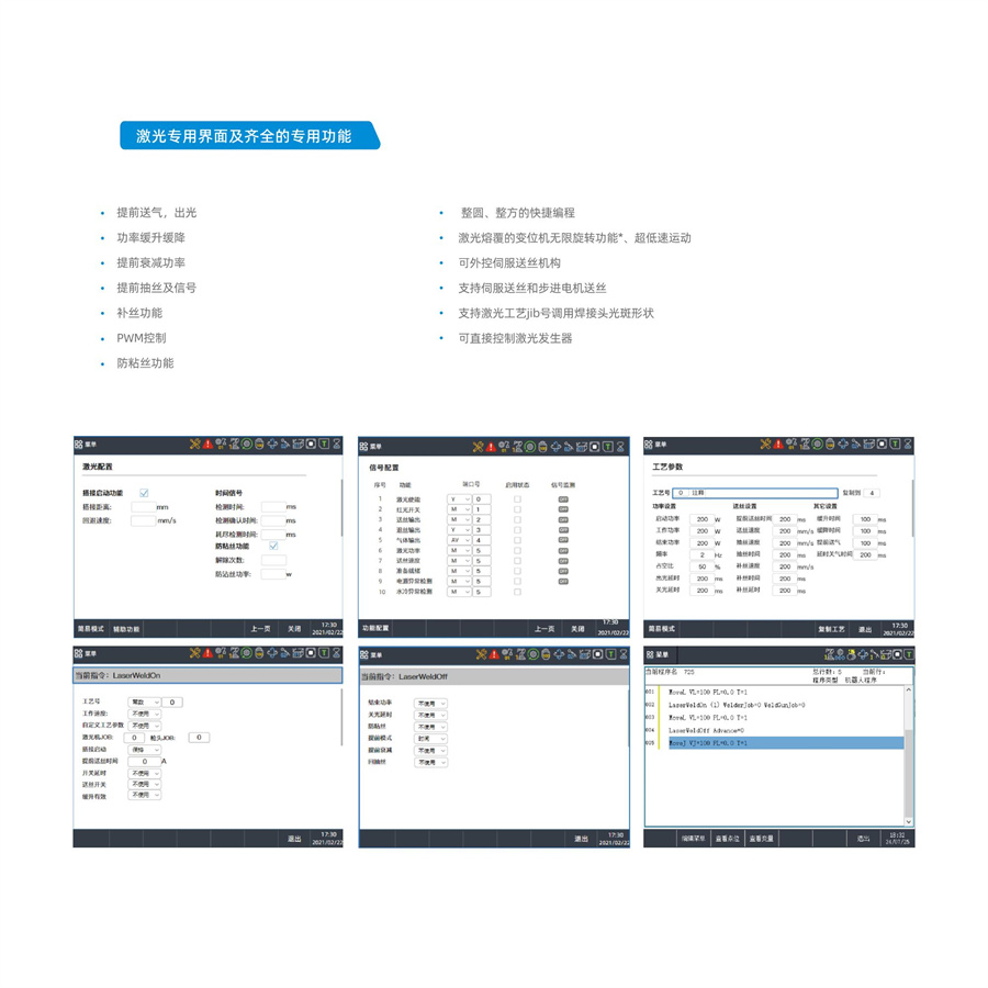 激光焊专用界面,可控功率、送丝、缓升缓降、提前出光及衰减、粘丝检测、提前抽丝及补丝等。